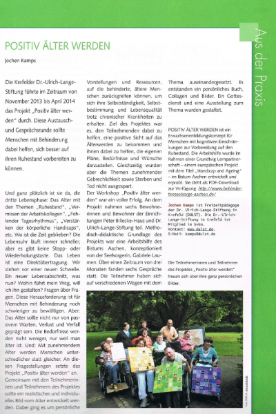Die Dr. Ulrich-Lange-Stiftung freut sich über einen gelungenen Artikel in der Zeitschrift "Das Band" des BVKM über die Arbeit "positiv älter werden".